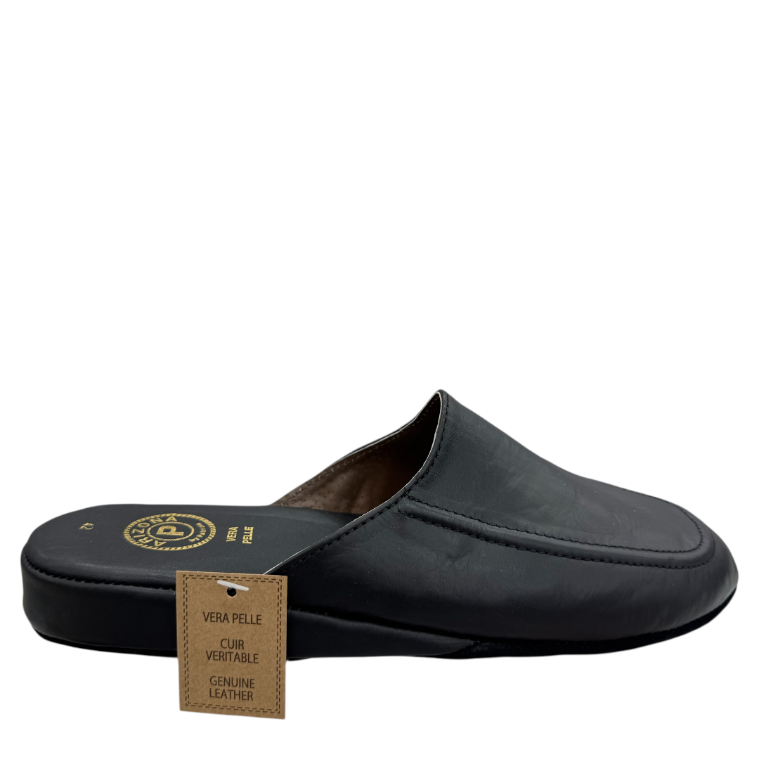 Pantoufles homme en cuir véritable noir, élégantes et durables. Confort respirant idéal pour la maison. Commandez en ligne dès maintenant