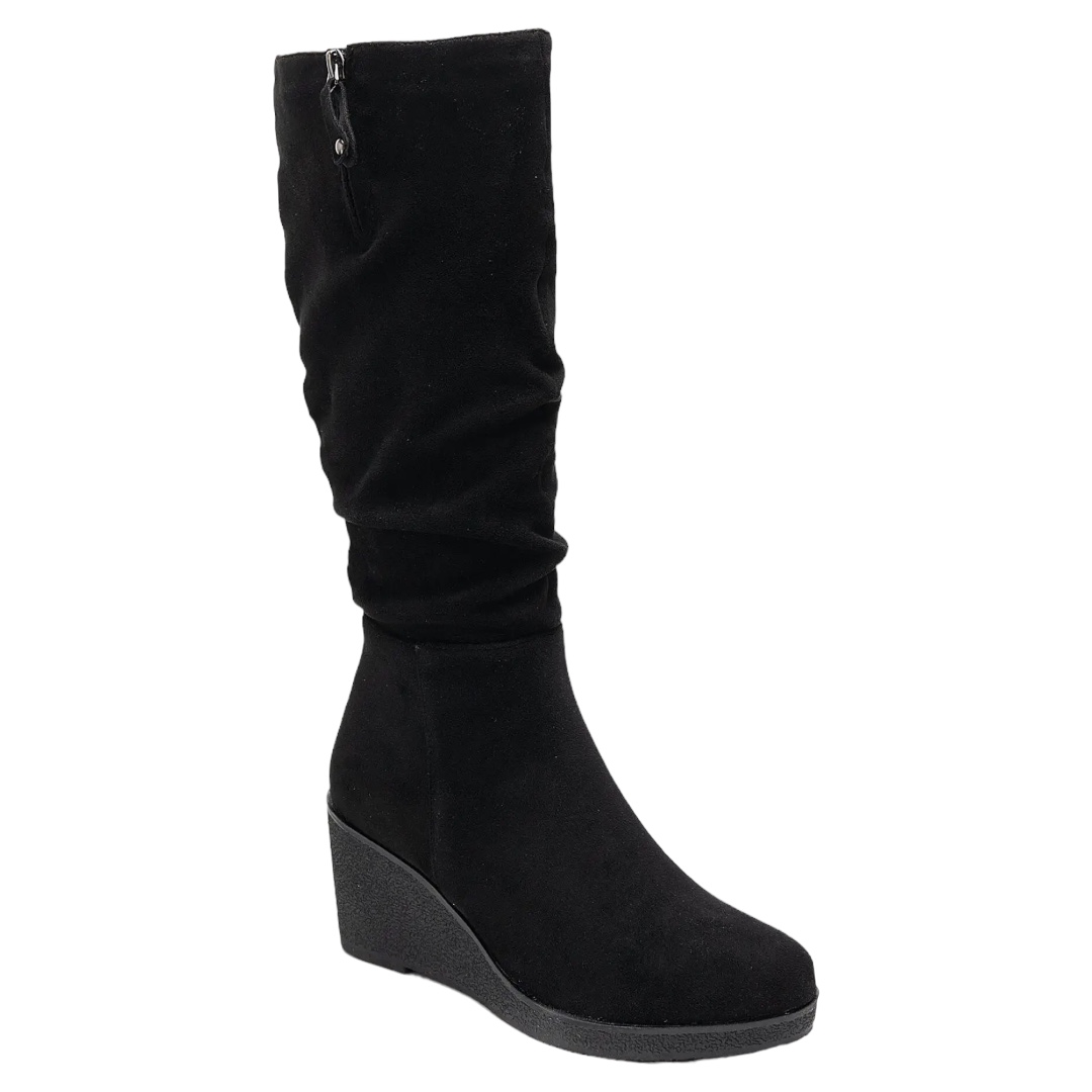 Bottes compensées La Marquise en simili daim noir, silhouette élancée et chic. Confortables et sûres grâce à leur semelle antidérapante. Commandez-les en ligne dès maintenant
