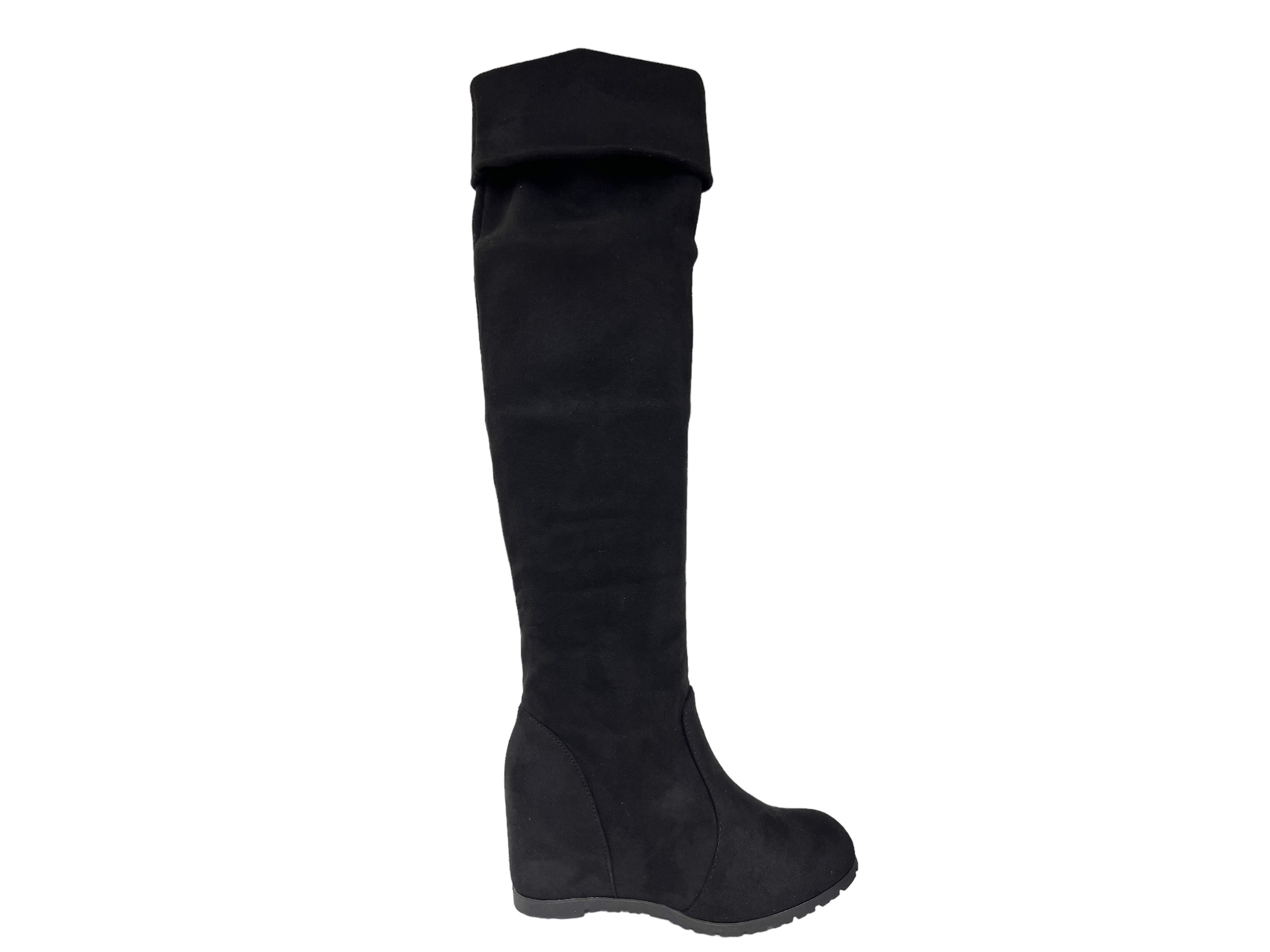 Bottes compensées noires avec talon 9 cm pour une silhouette élancée. Confort souple et mollet extensible. Commandez en ligne dès maintenant