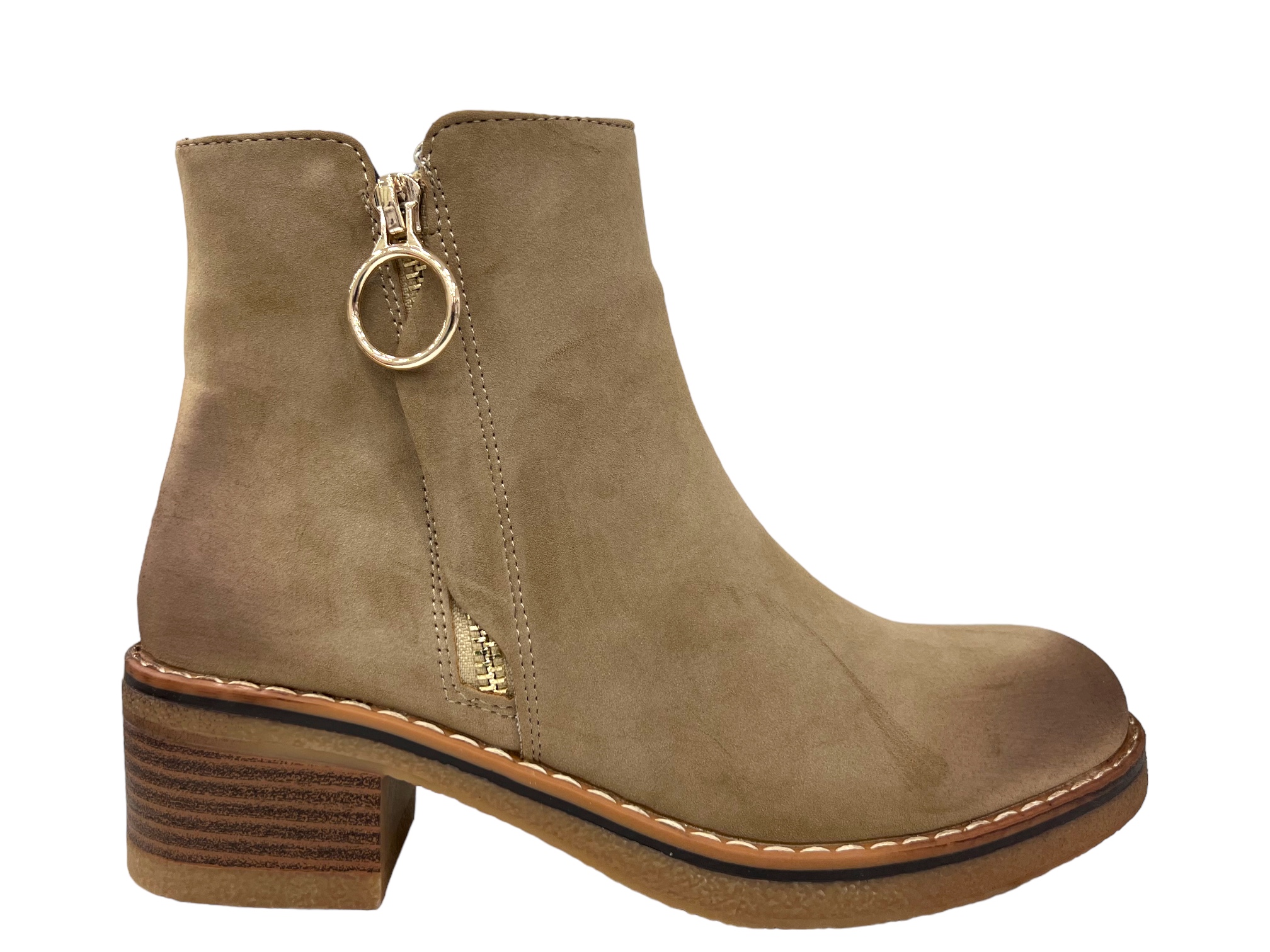 Bottines taupe à talon 5cm en cuir synthétique, élégantes et résistantes. Confort assuré pour toutes vos journées actives. Commandez en ligne dès maintenant