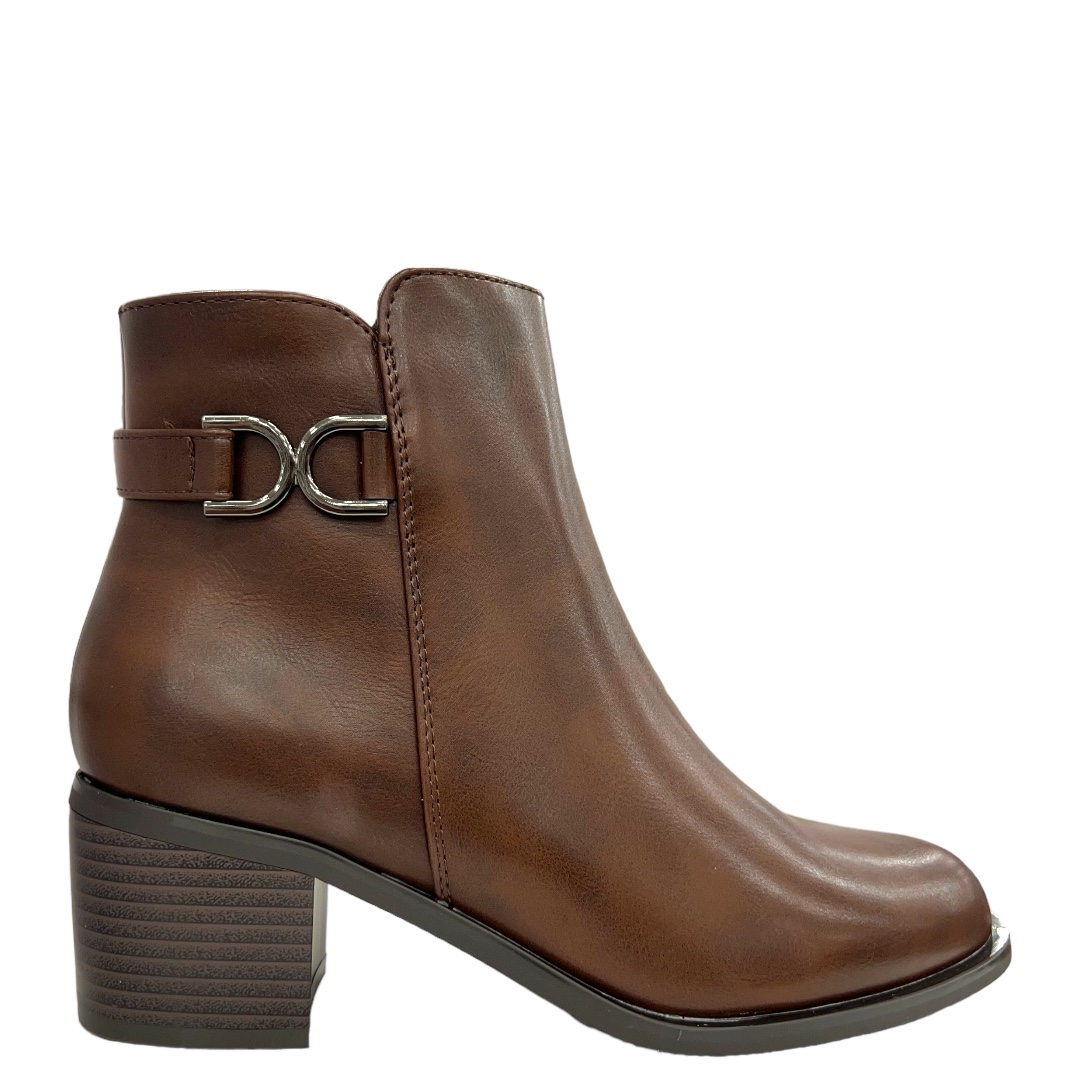 Bottines brunes à talon 6 cm en cuir synthétique, élégantes et résistantes. Confortables pour toutes vos journées actives. Commandez en ligne dès maintenant