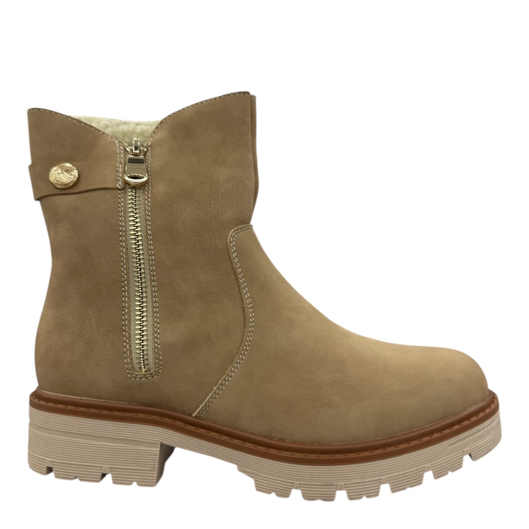 Bottines taupe à talon en cuir synthétique, élégantes et fourrées pour l’hiver. Chaleur et confort au quotidien. Commandez-les en ligne dès maintenant