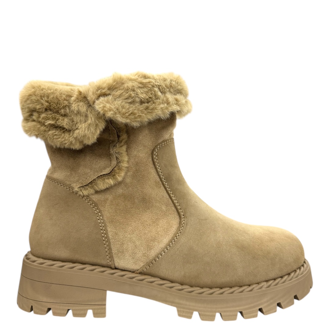 Bottines taupe à talon en cuir synthétique élégant, doublées pour la chaleur. Parfaites pour l’hiver urbain. Commandez en ligne dès maintenant