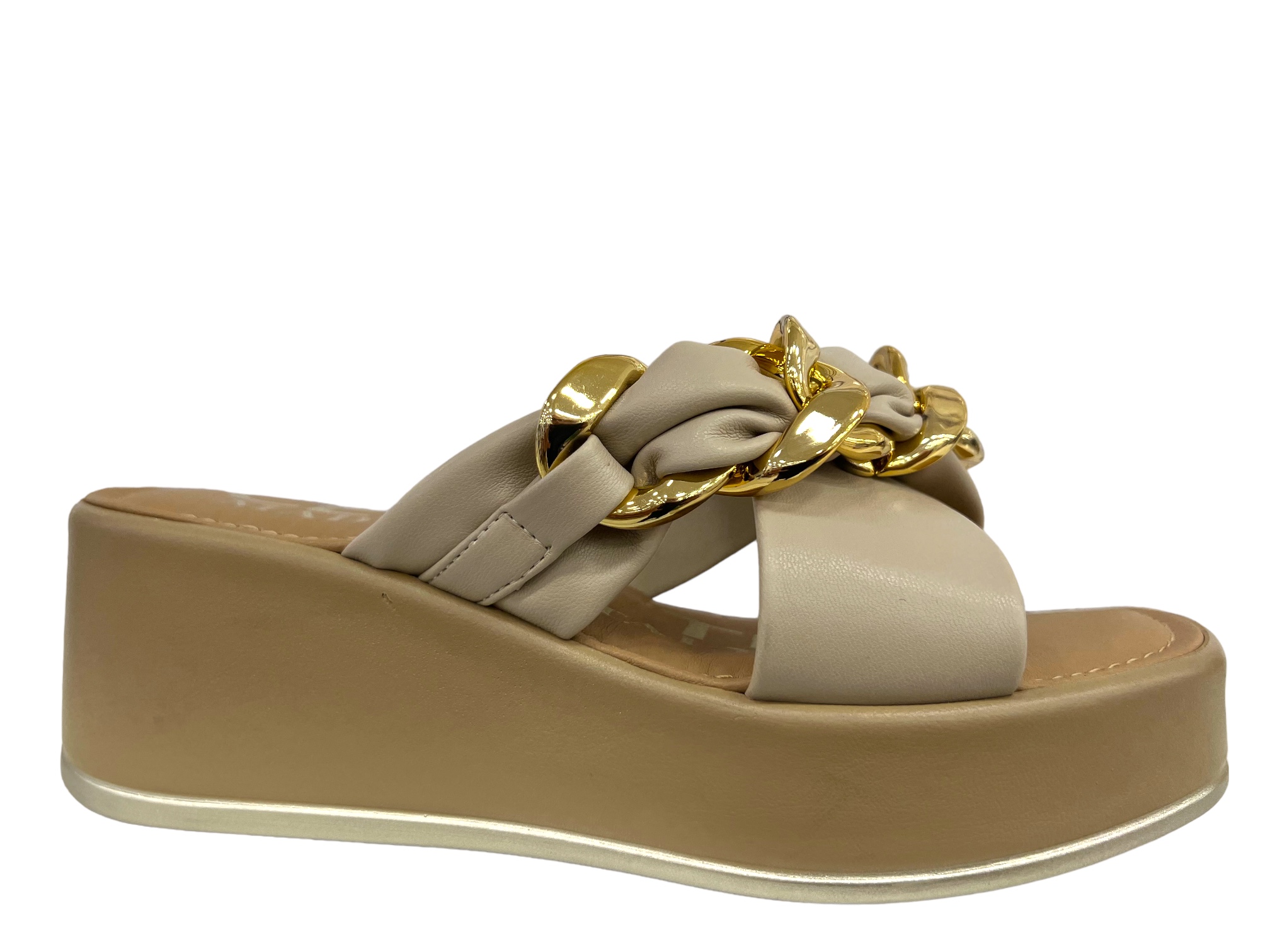 Mules compensées Cerutti en beige, élégantes avec talon de 7 cm. Confort italien et semelle antidérapante pour vos sorties. Commandez en ligne dès maintenant