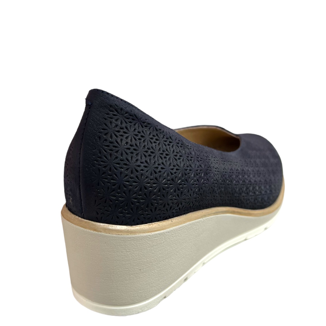 Chaussures compensées D'Chicas en cuir bleu, élégantes et confortables. Semelle antidérapante pour marcher en toute confiance. Commandez-les en ligne dès maintenant
