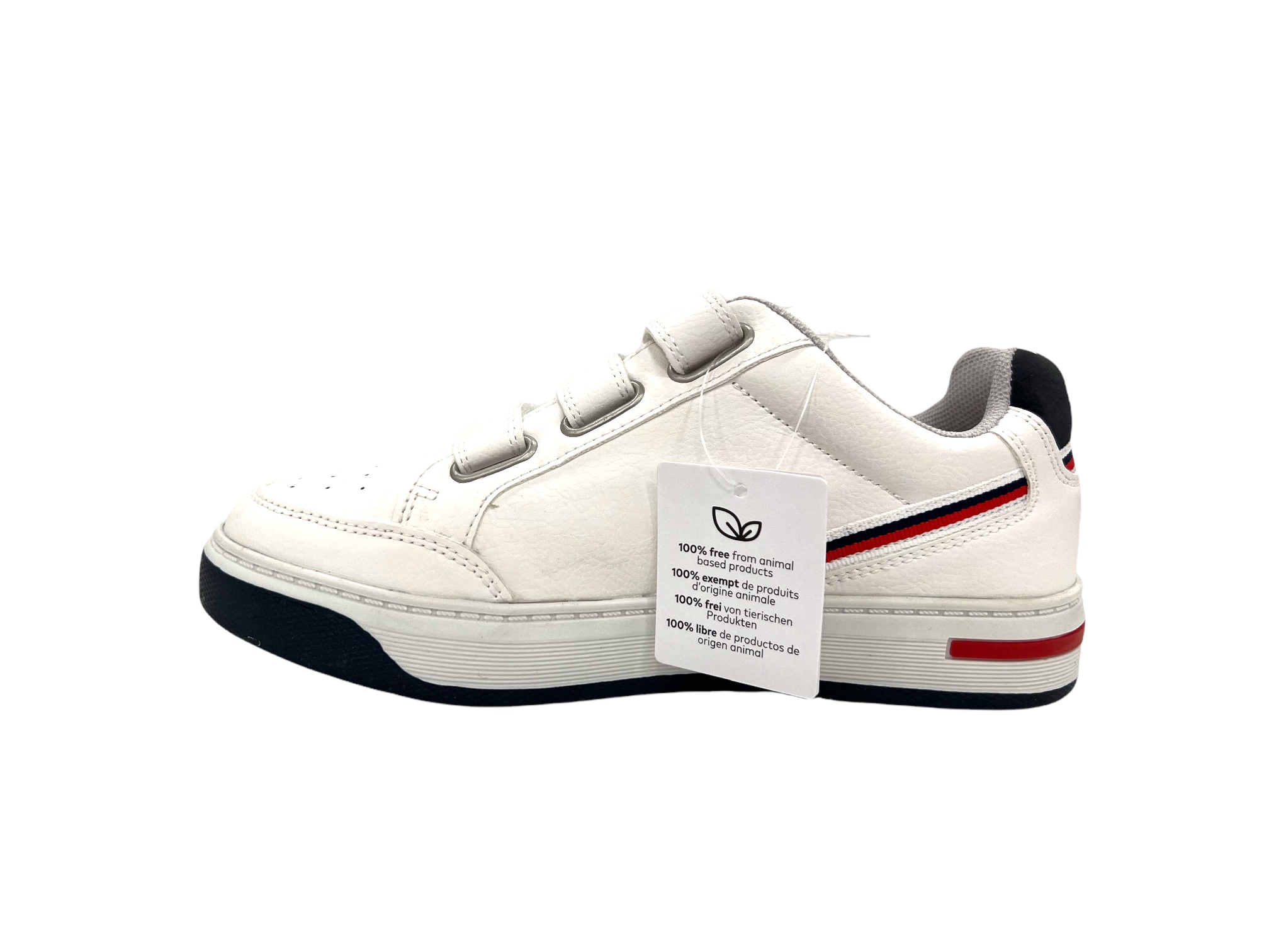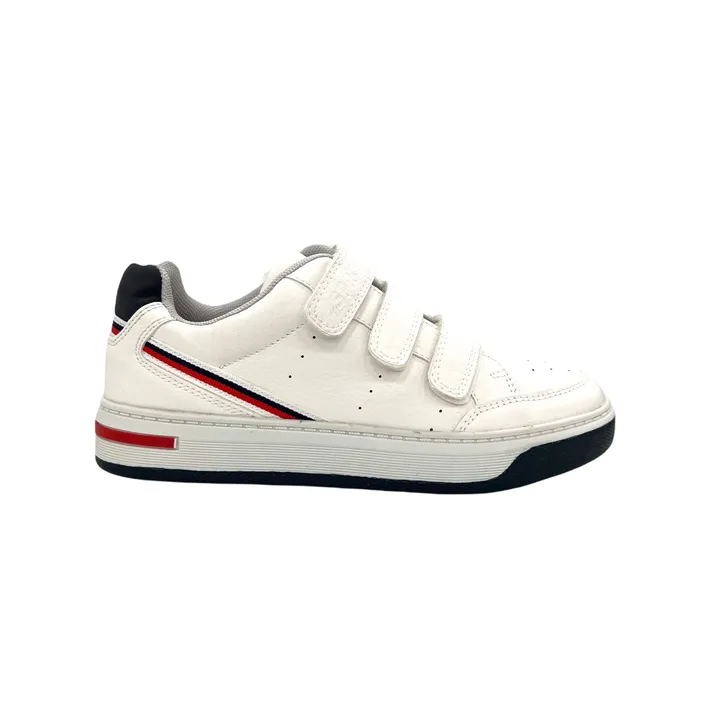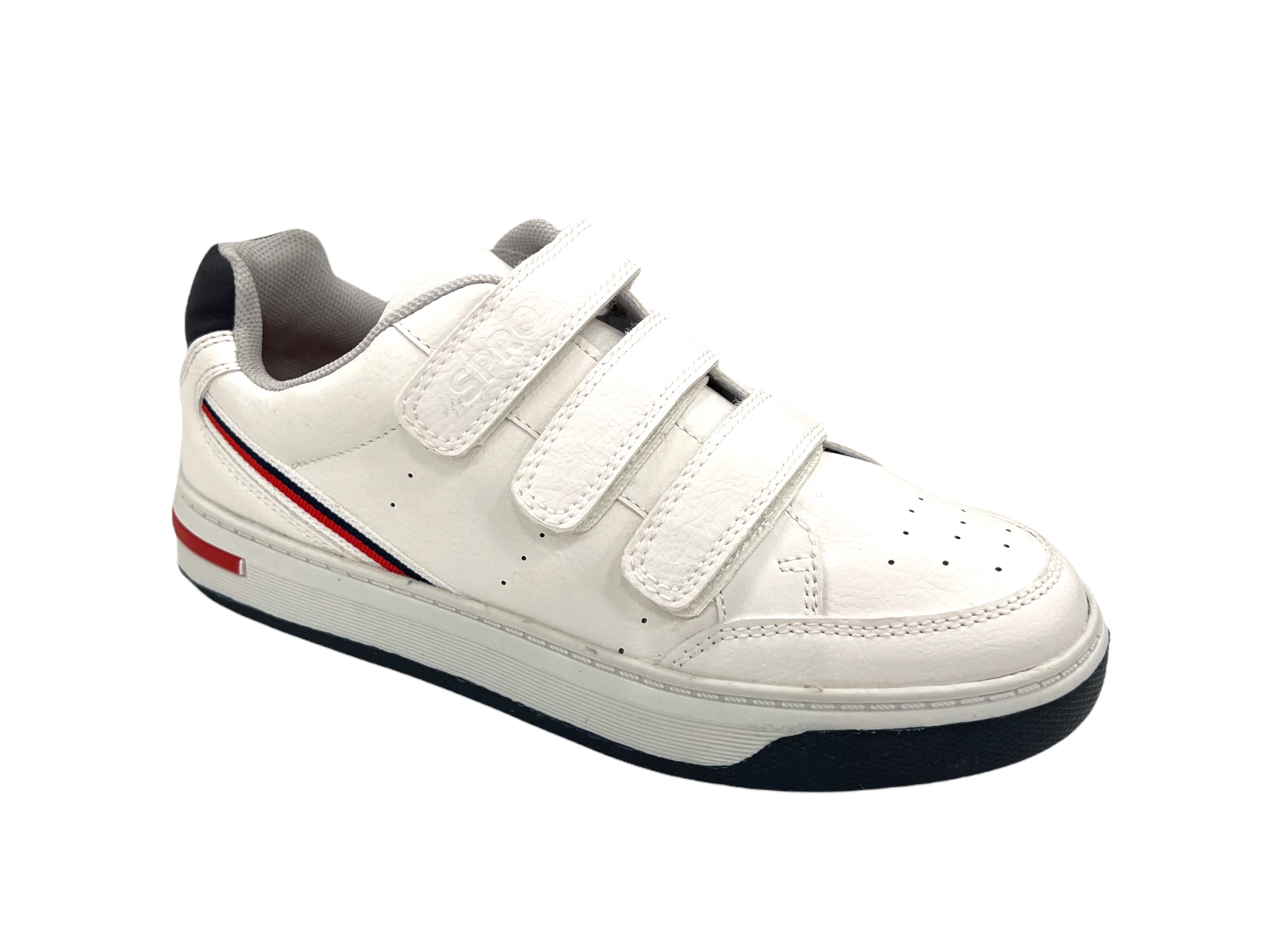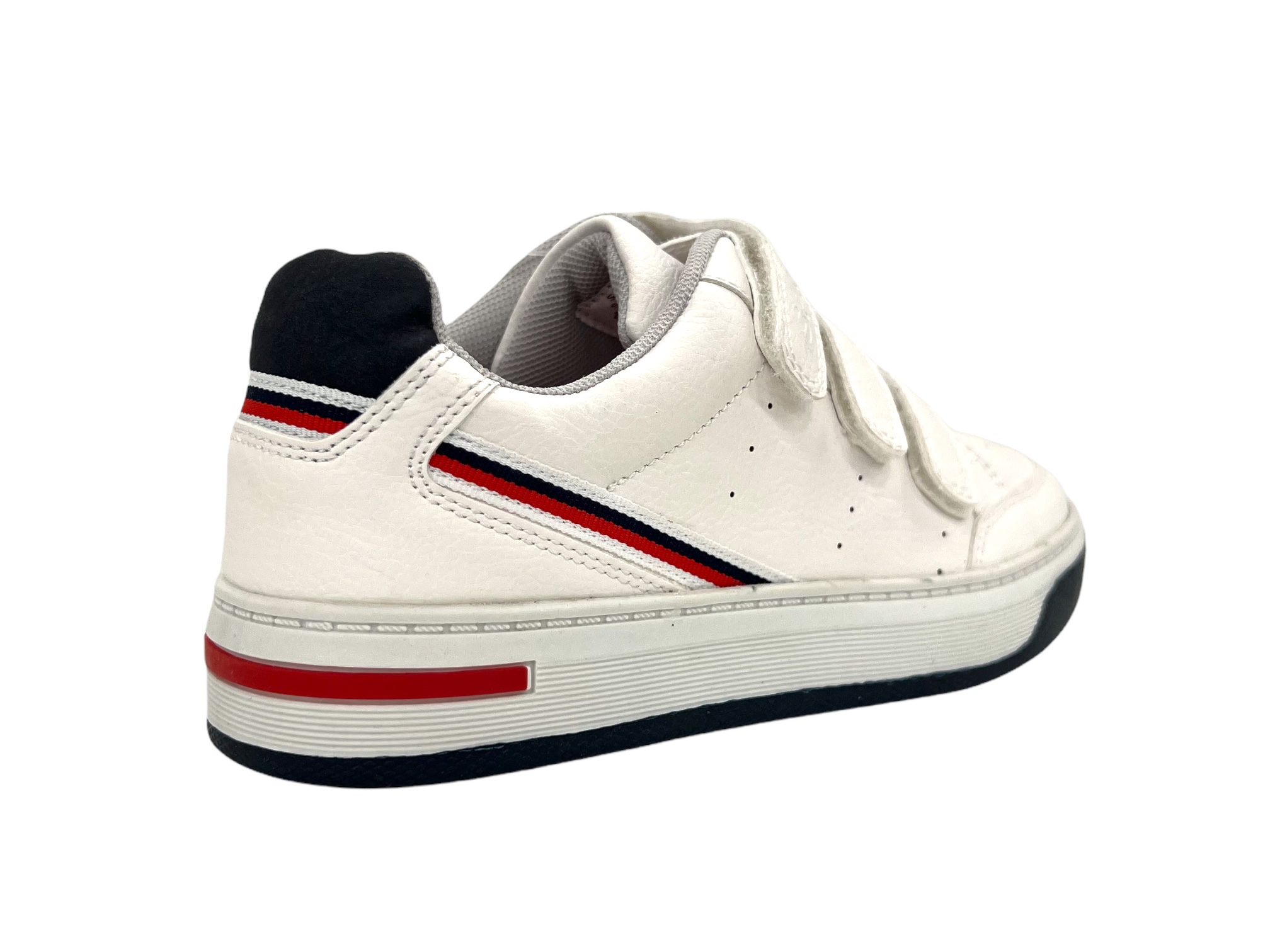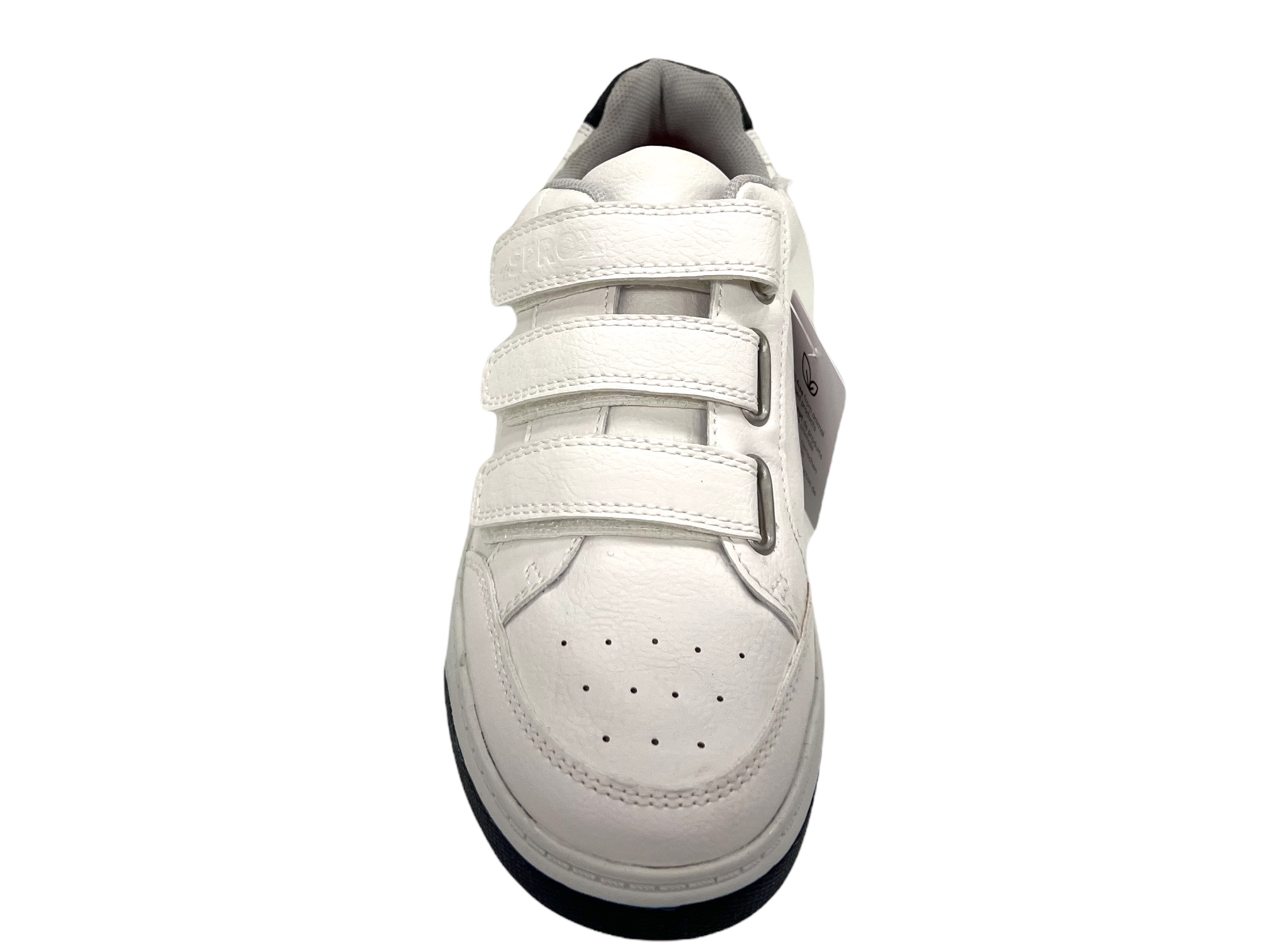 Boys’ sneakers in crisp white and blue with easy velcro closure for all-day play. Durable, non-slip comfort for active kids. Order online now