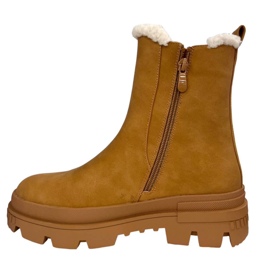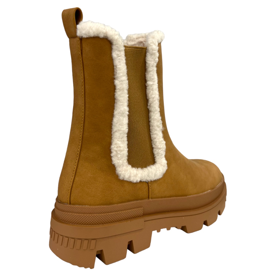 Camel ankle boots with a 5.5 cm heel, crafted in premium vegan leather for lasting comfort. Fur-lined for cozy warmth on colder days. Order online now for effortless style and comfort