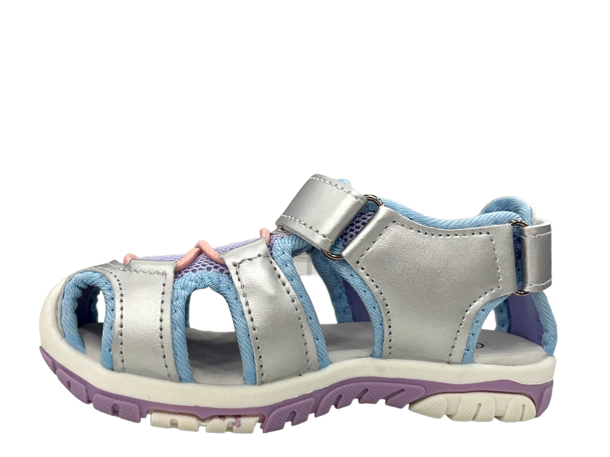 Girls' silver sandals in premium synthetic, lightweight and scratch-resistant. Anti-slip sole ensures safety for active days. Order online now