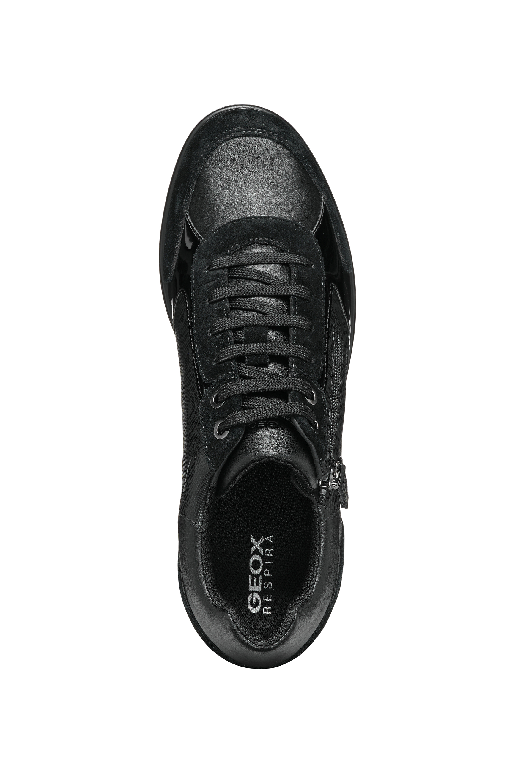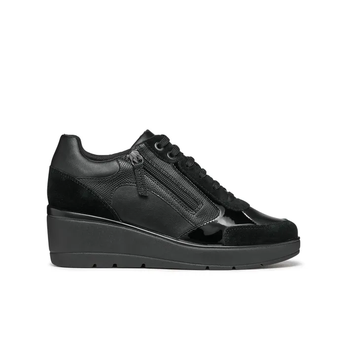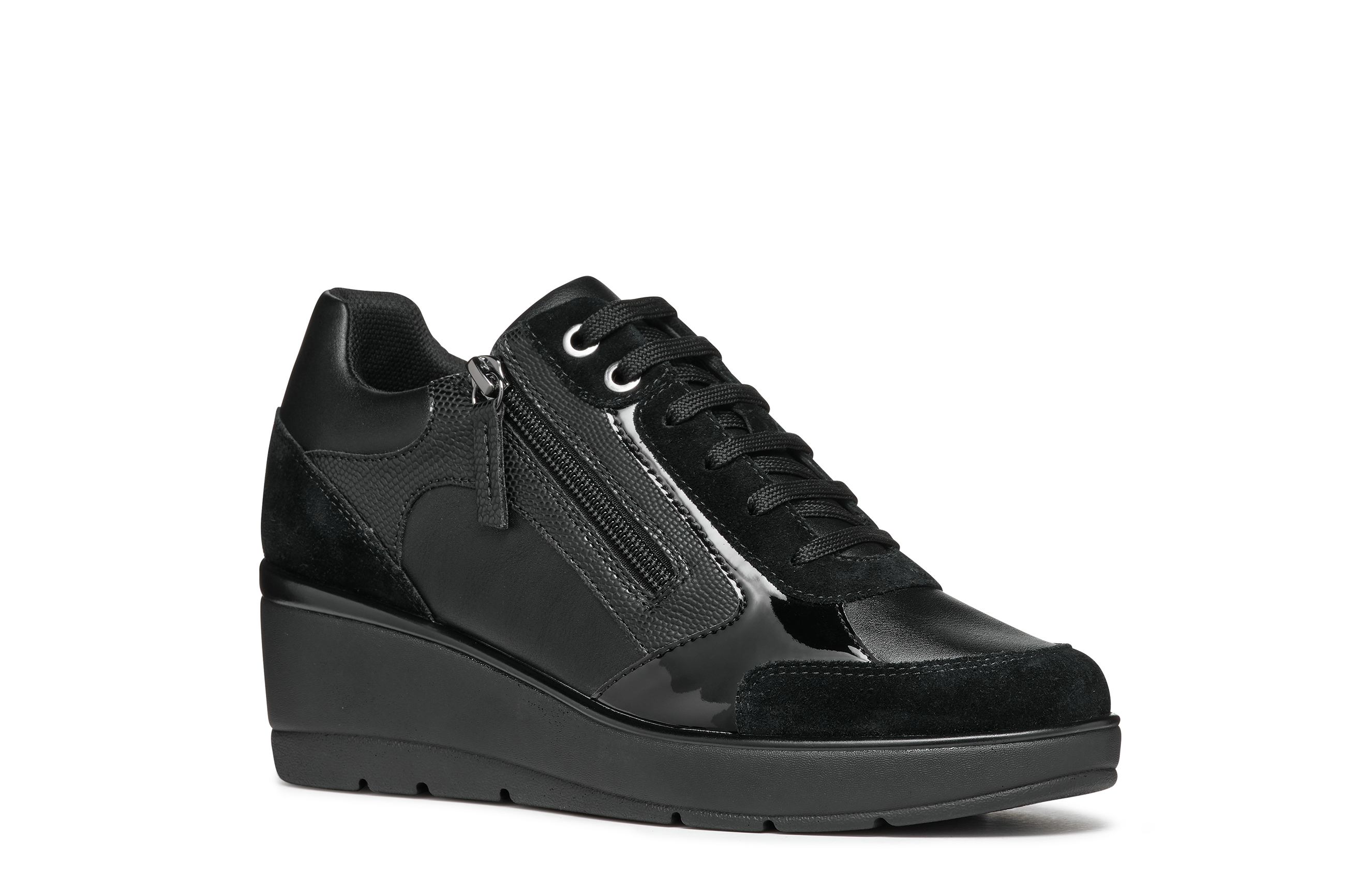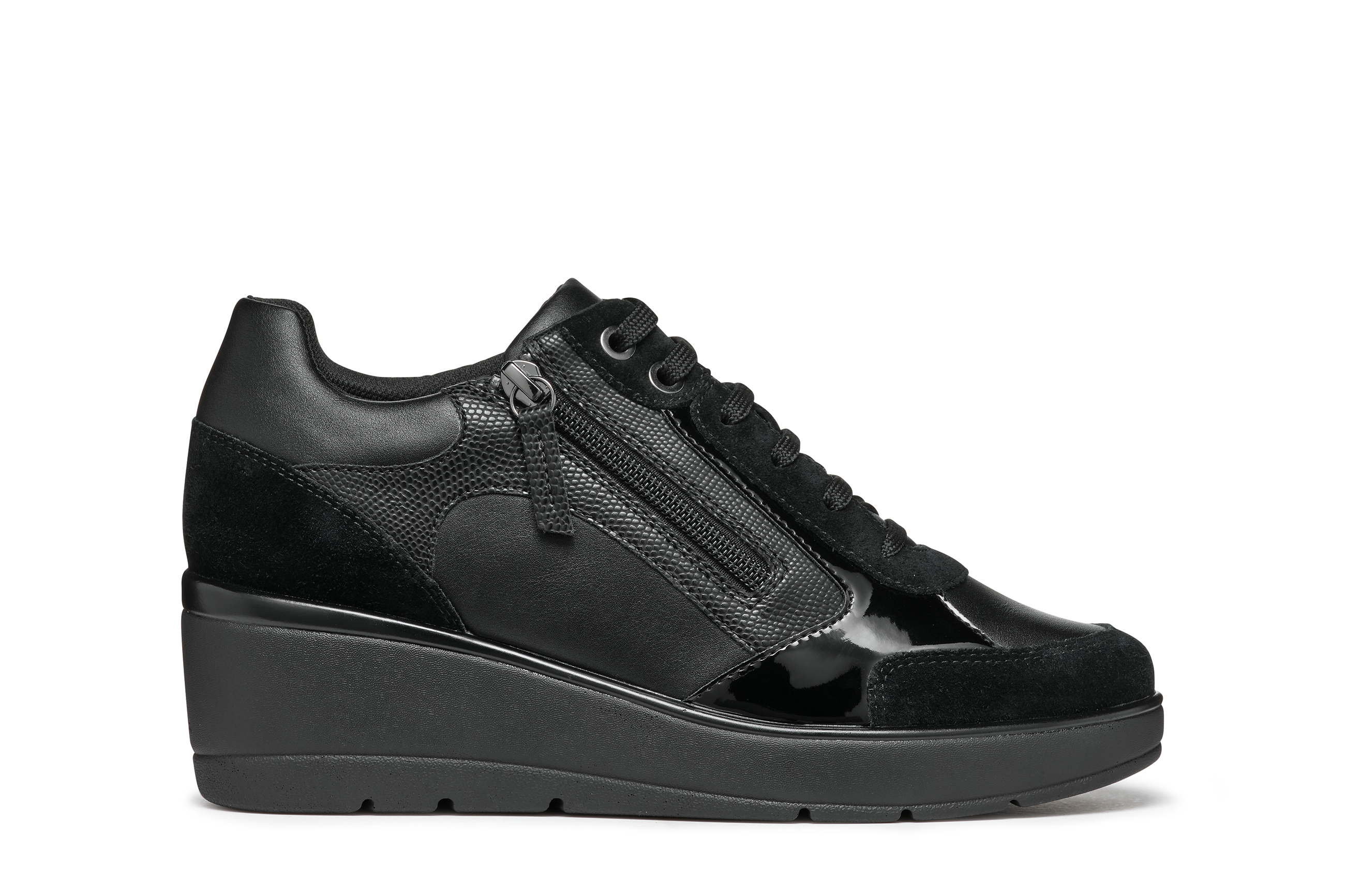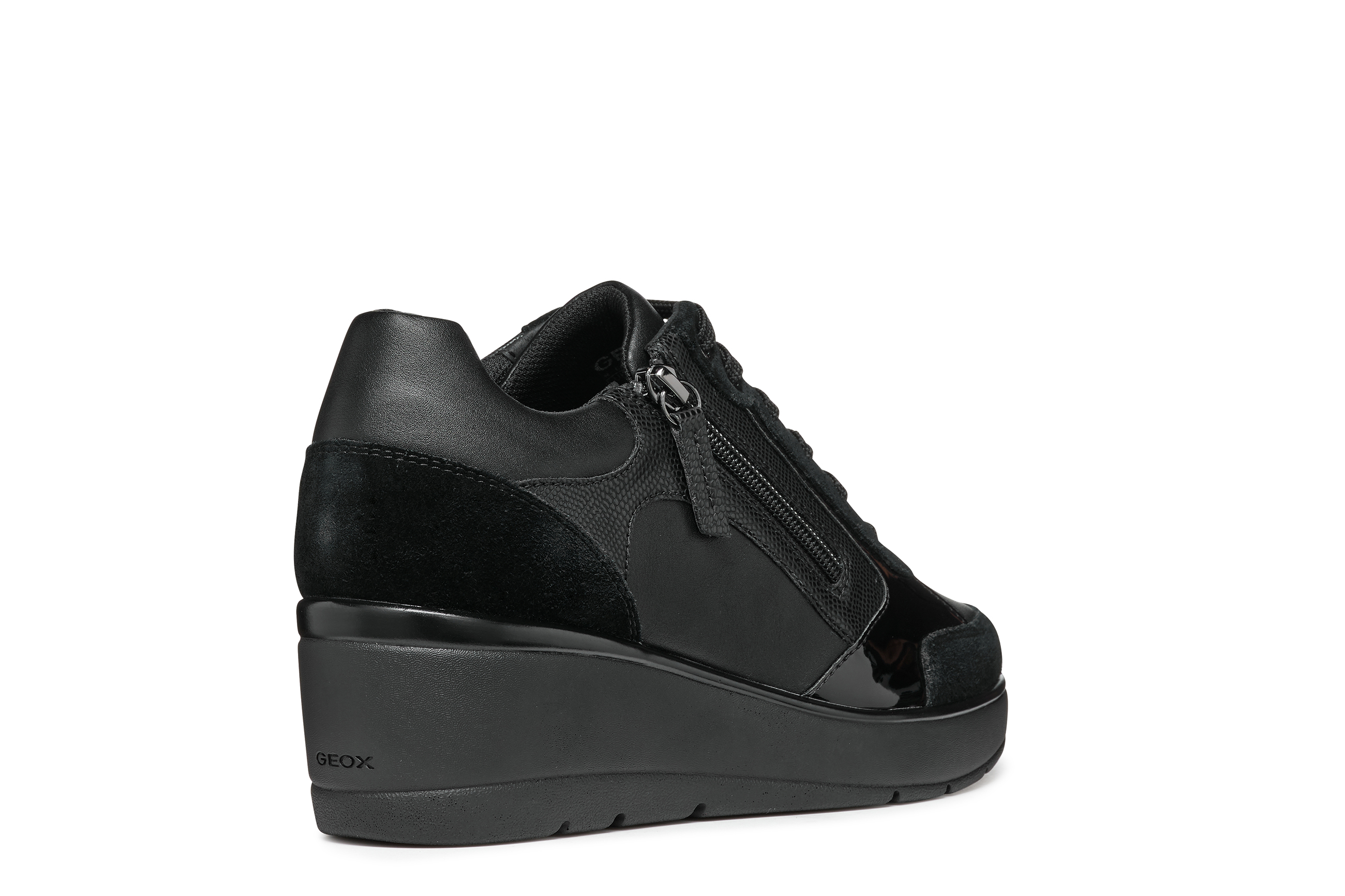 Women's black sneakers with a 6cm compensated heel for style and comfort. Breathable Geox Respira technology keeps your feet fresh all day. Order online now