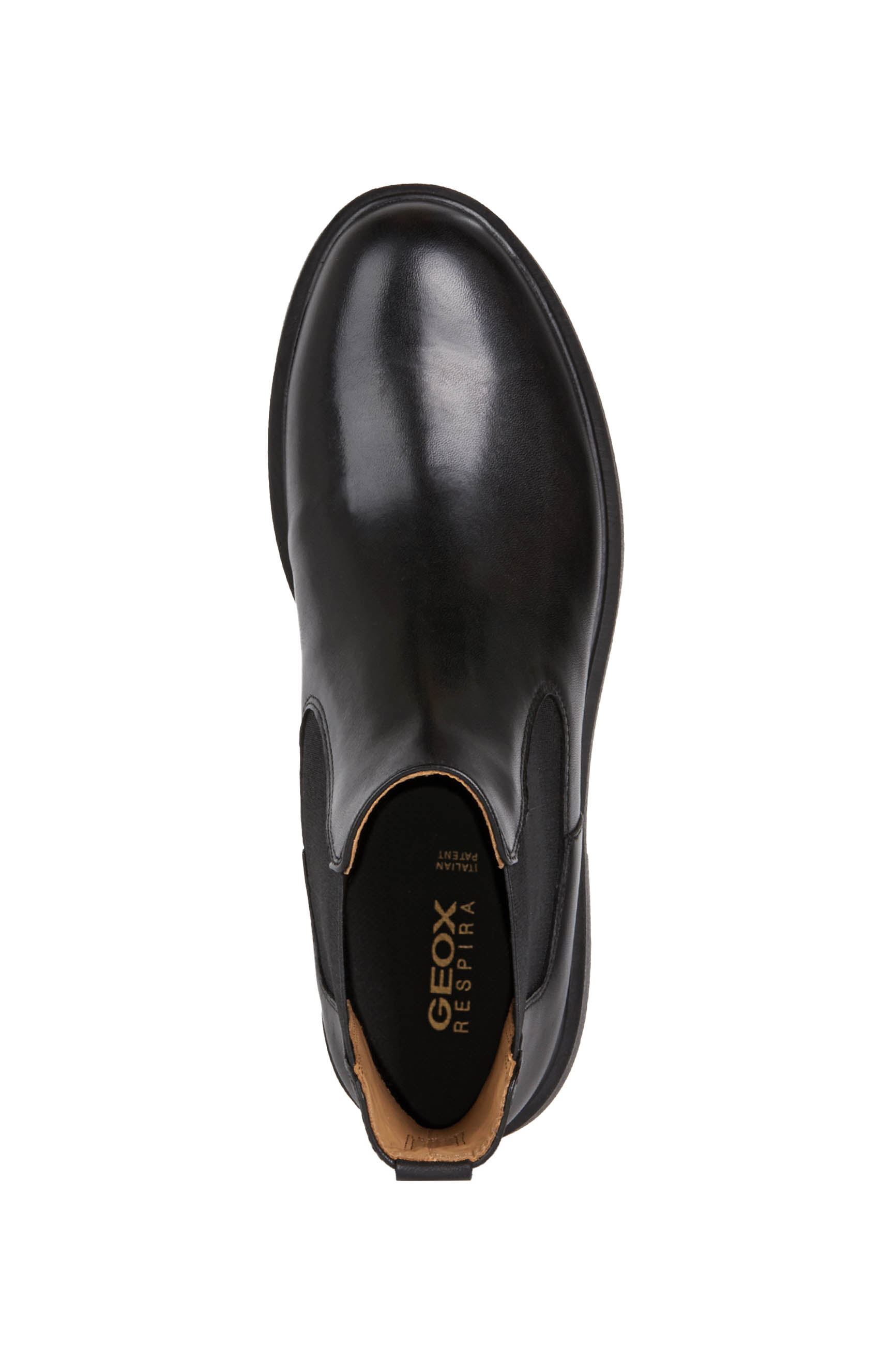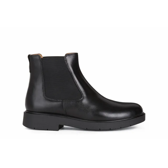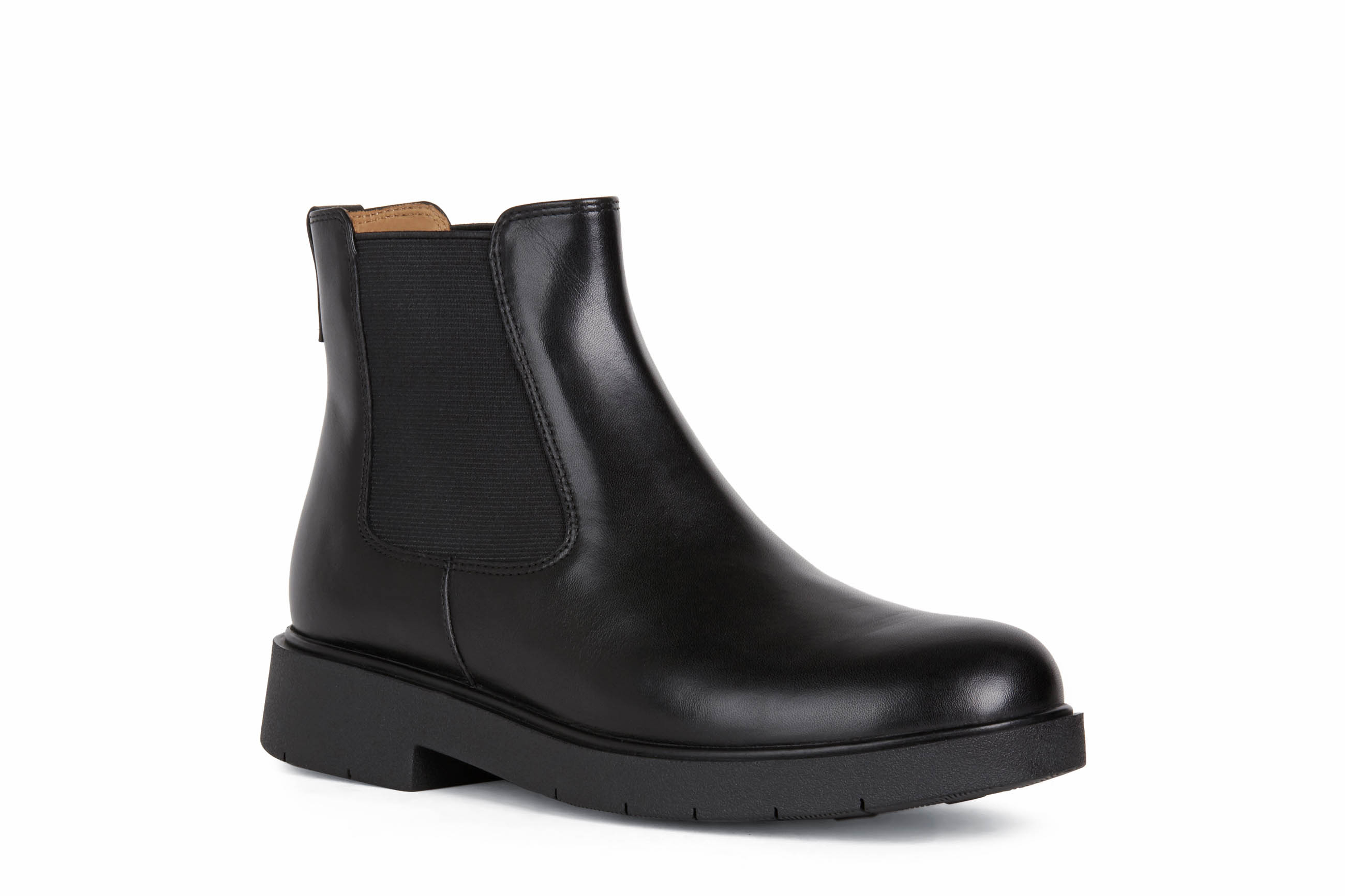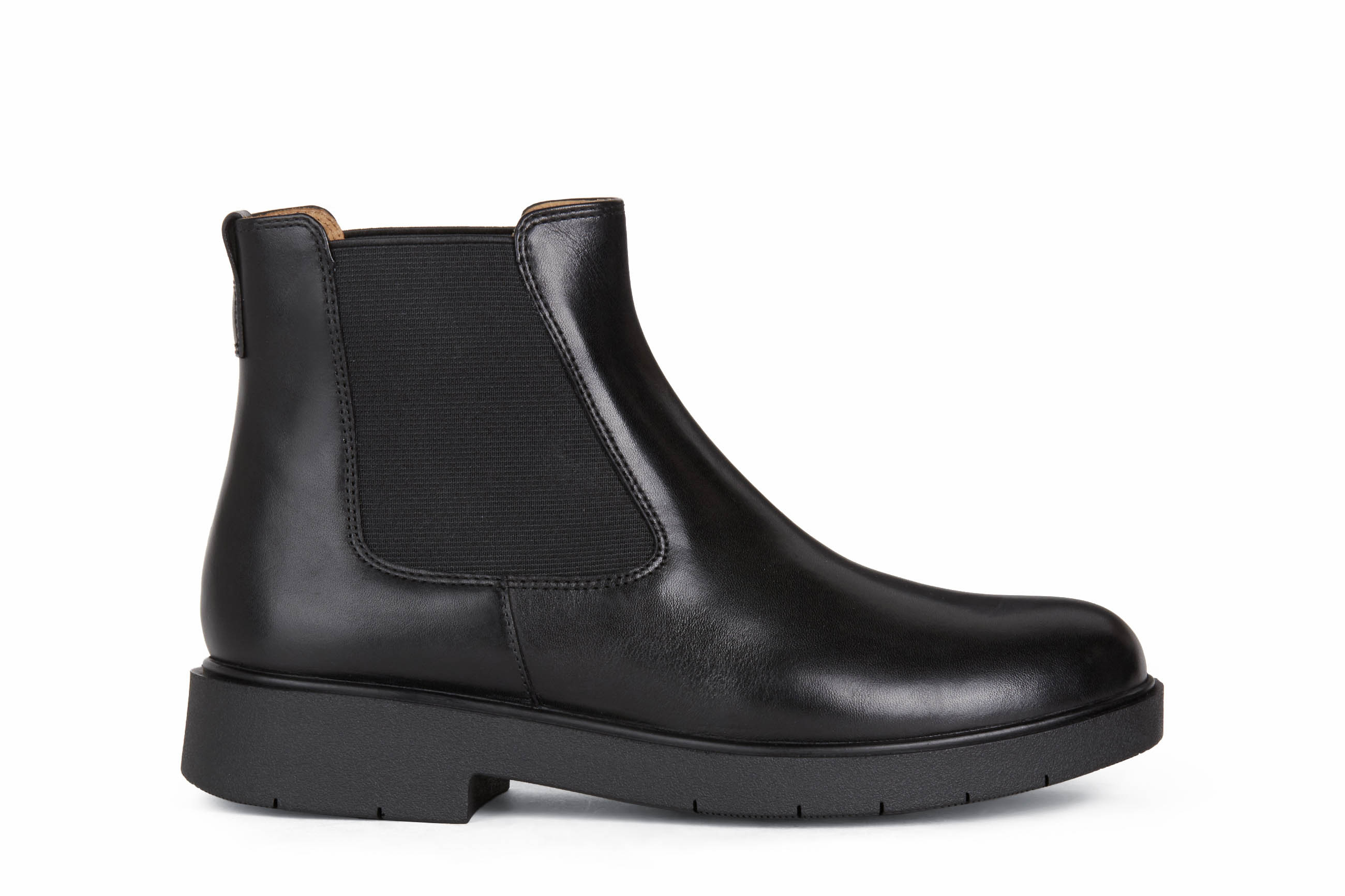 Women's ankle boots in premium black leather with 3D-cushioned Geox Spherica sole. All-day comfort meets timeless style. Order online now