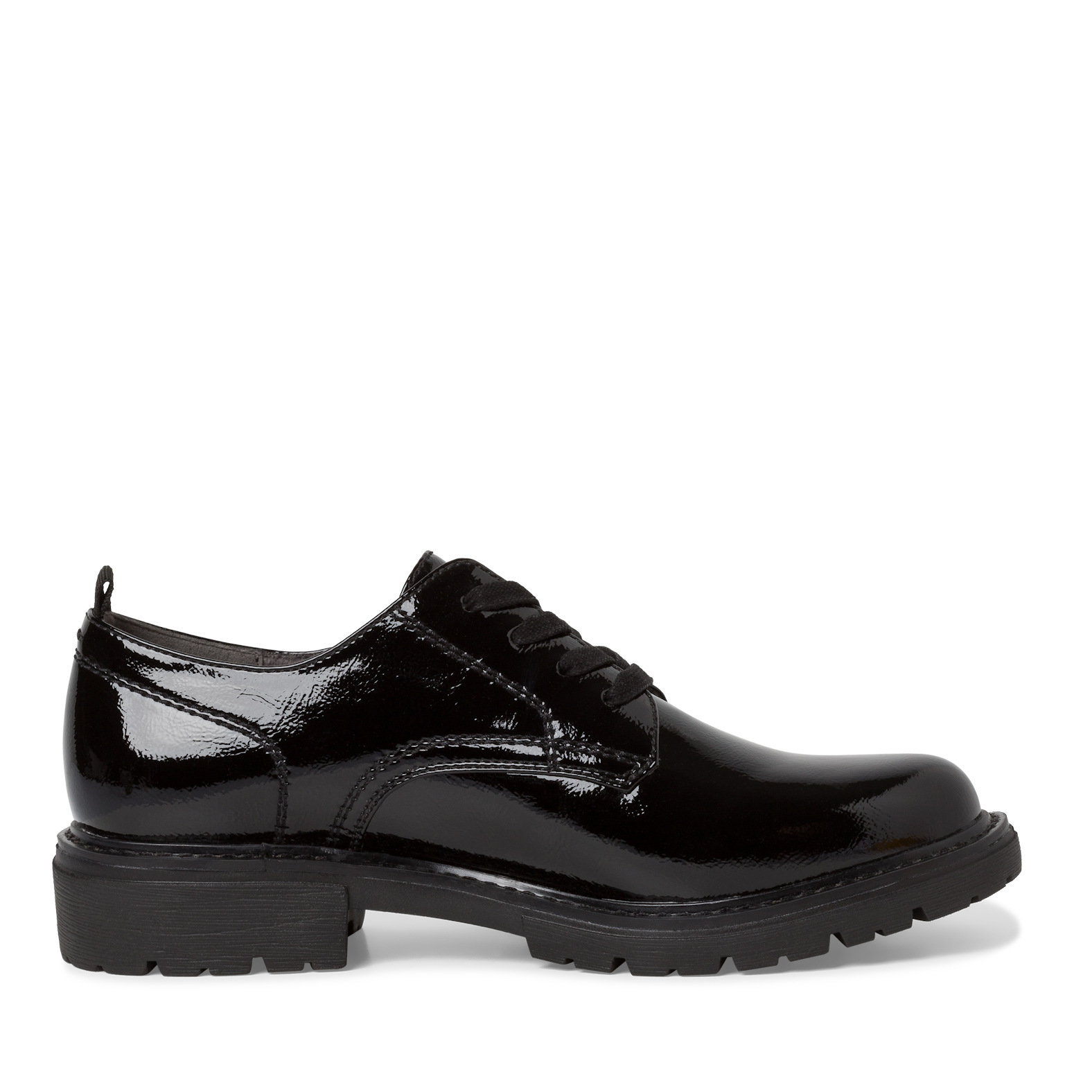 Wide-fit flat derbie in elegant black vegan leather for all-day comfort. Non-slip sole keeps you secure on any surface. Order online for effortless style and support