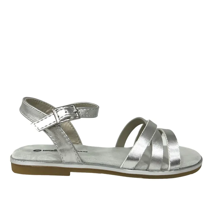Girls’ velcro sandals in shimmering silver with durable, easy-care vegan leather. Non-slip sole keeps every step safe—order online now