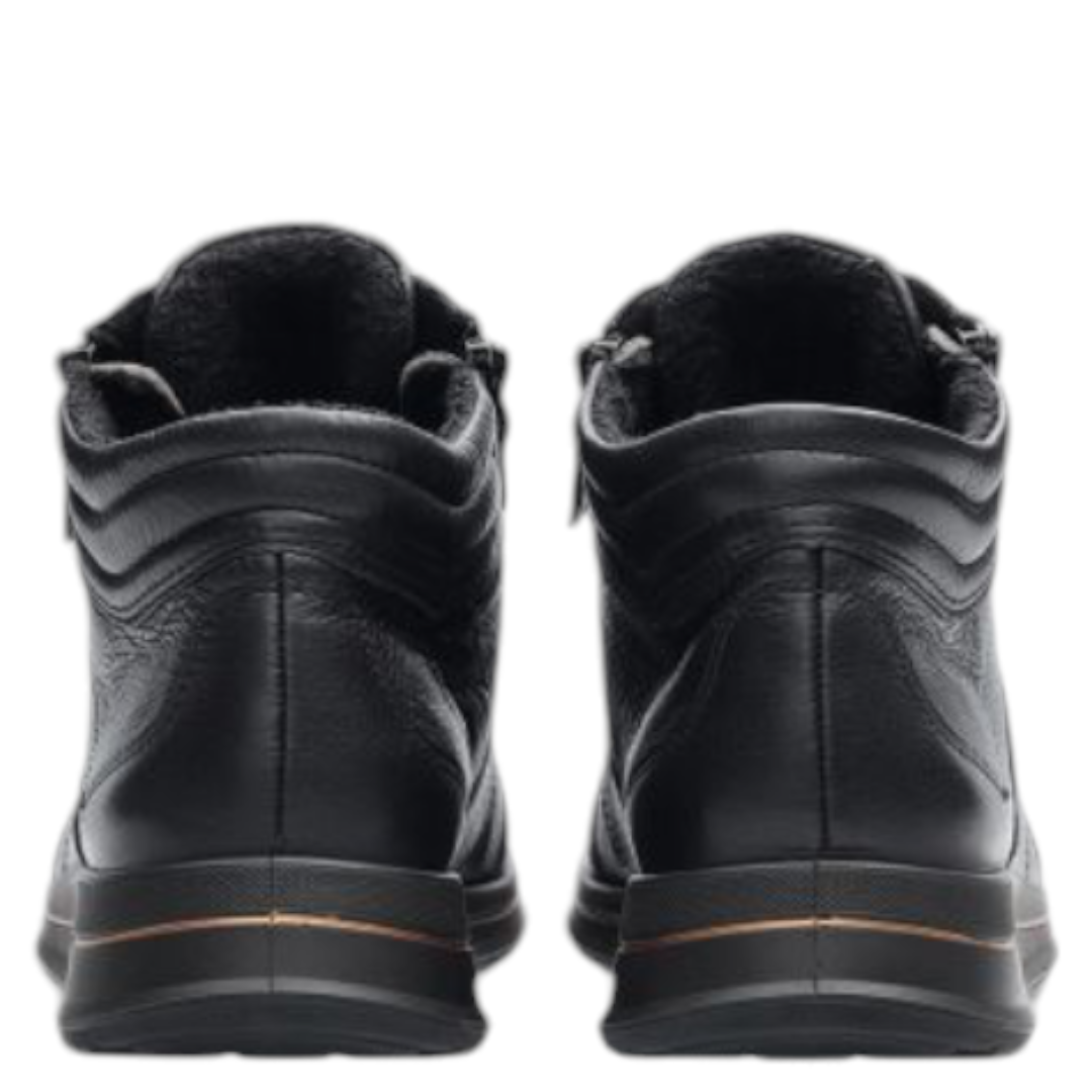 Zwarte leren enkellaarsjes met comfortabele 3 cm wig en warme voering. Perfect voor dagelijks stijlvol comfort. Bestel direct online