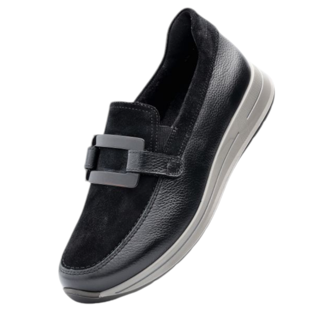 Luxe zwarte leren loafers met 3 cm hak en extra brede pasvorm. Ultiem comfort voor elke dag. Bestel direct online