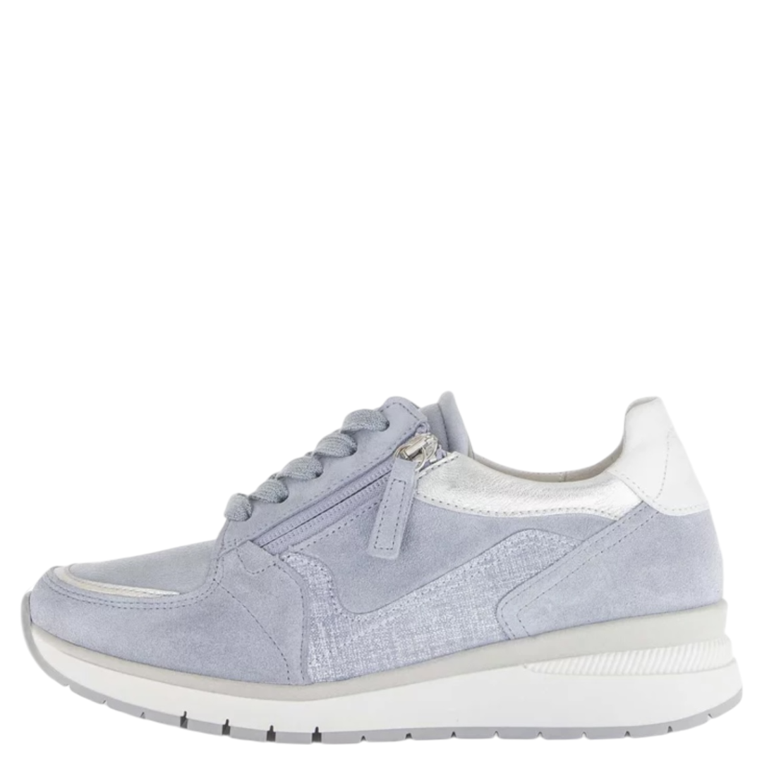 Gecompenseerde blauwe sneakers van Gabor in hoogwaardig leer voor stijlvol dagelijks comfort. Extra brede pasvorm en uitneembare zool voor ultiem welzijn. Bestel eenvoudig online