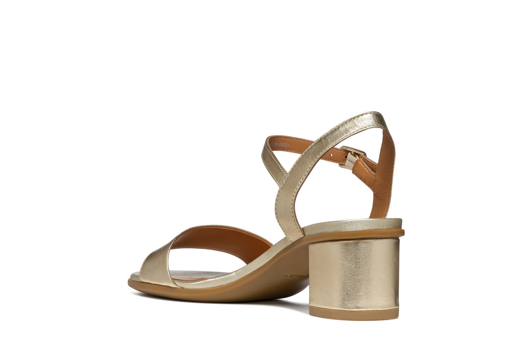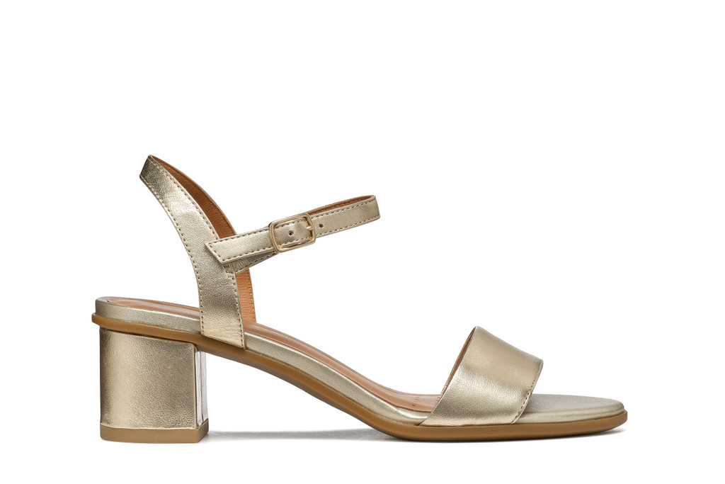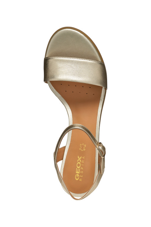 Gecompenseerde sandalen van Geox in goudkleurig leer met elegante 5,5 cm hak. Ademend comfort voor stijlvolle dagen. Bestel direct online