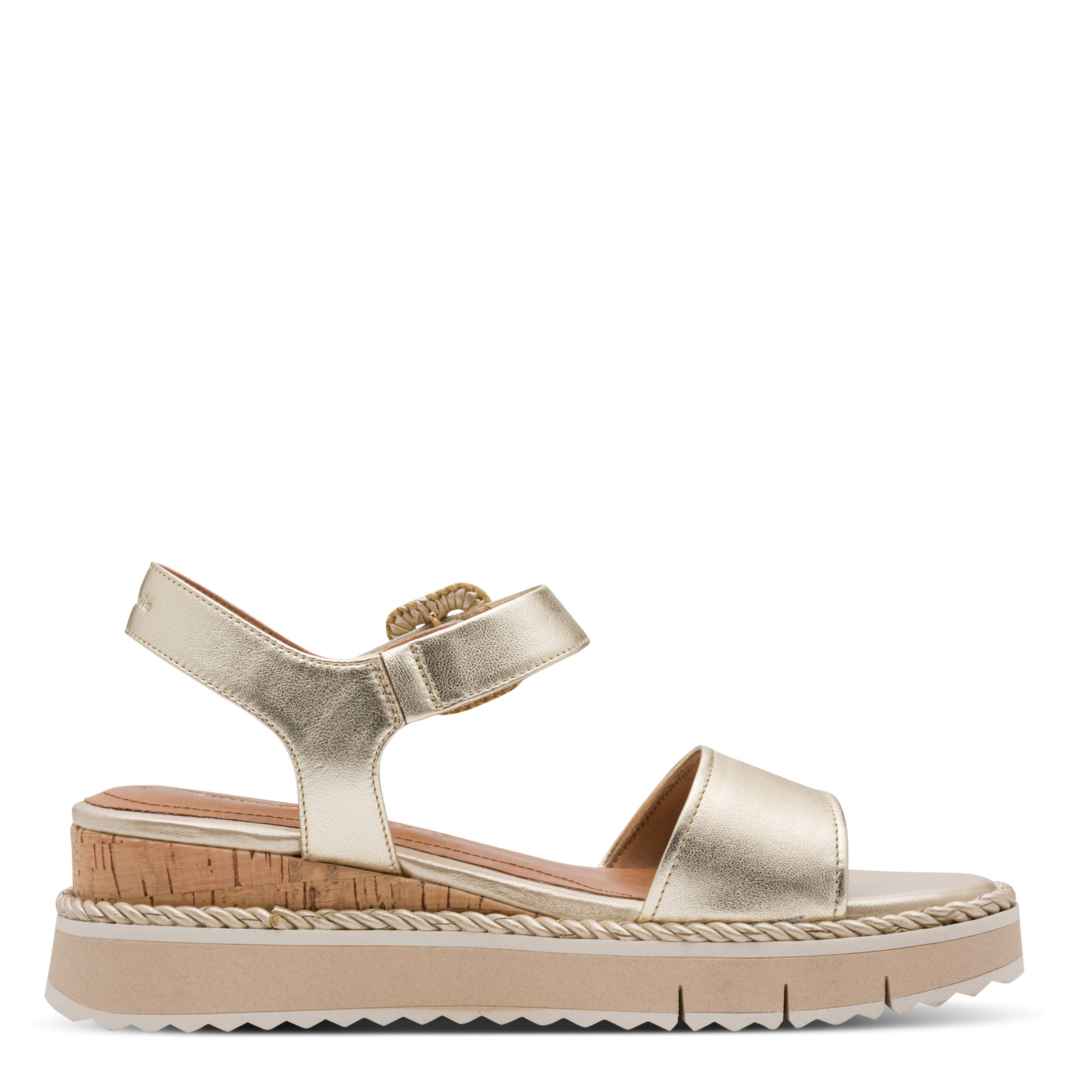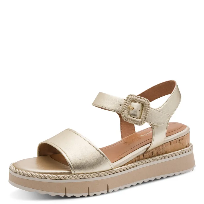 Op zoek naar een sandaal die je outfit meteen een zonnige, verfijnde touch geeft? Deze gouden gecompenseerde sandalen van Tamaris zijn gemaakt om moeiteloos mee te gaan van een drukke werkdag naar een diner of een feestje.