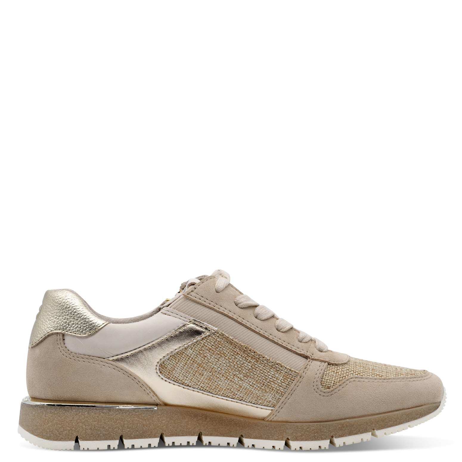 Gecompenseerde sneakers van Tamaris in luxueus ivoorkleurig suède-leer met 5 cm hak. Extra comfort dankzij G-breedte en uitneembare leren binnenzool. Bestel direct online voor stijl en gemak