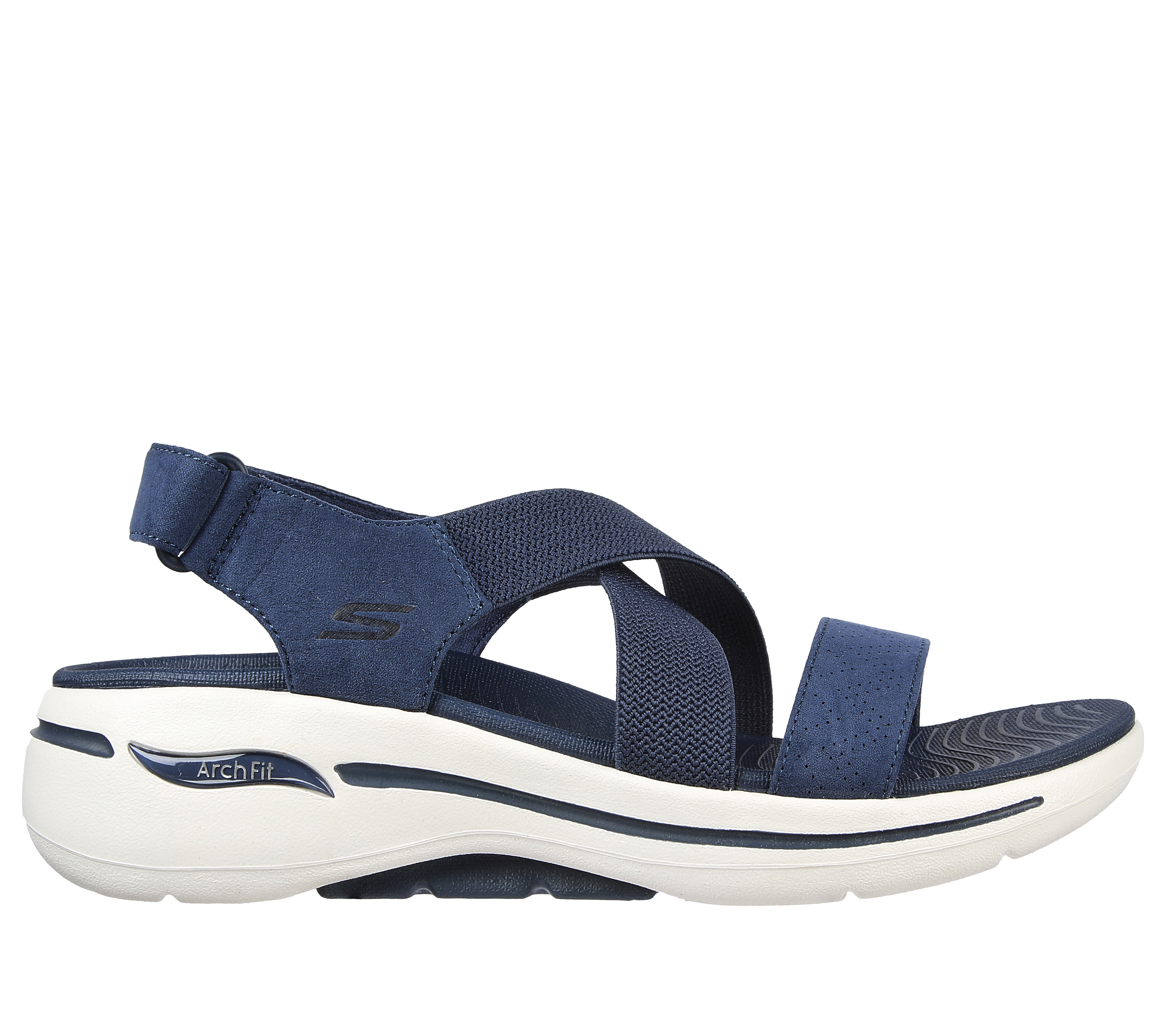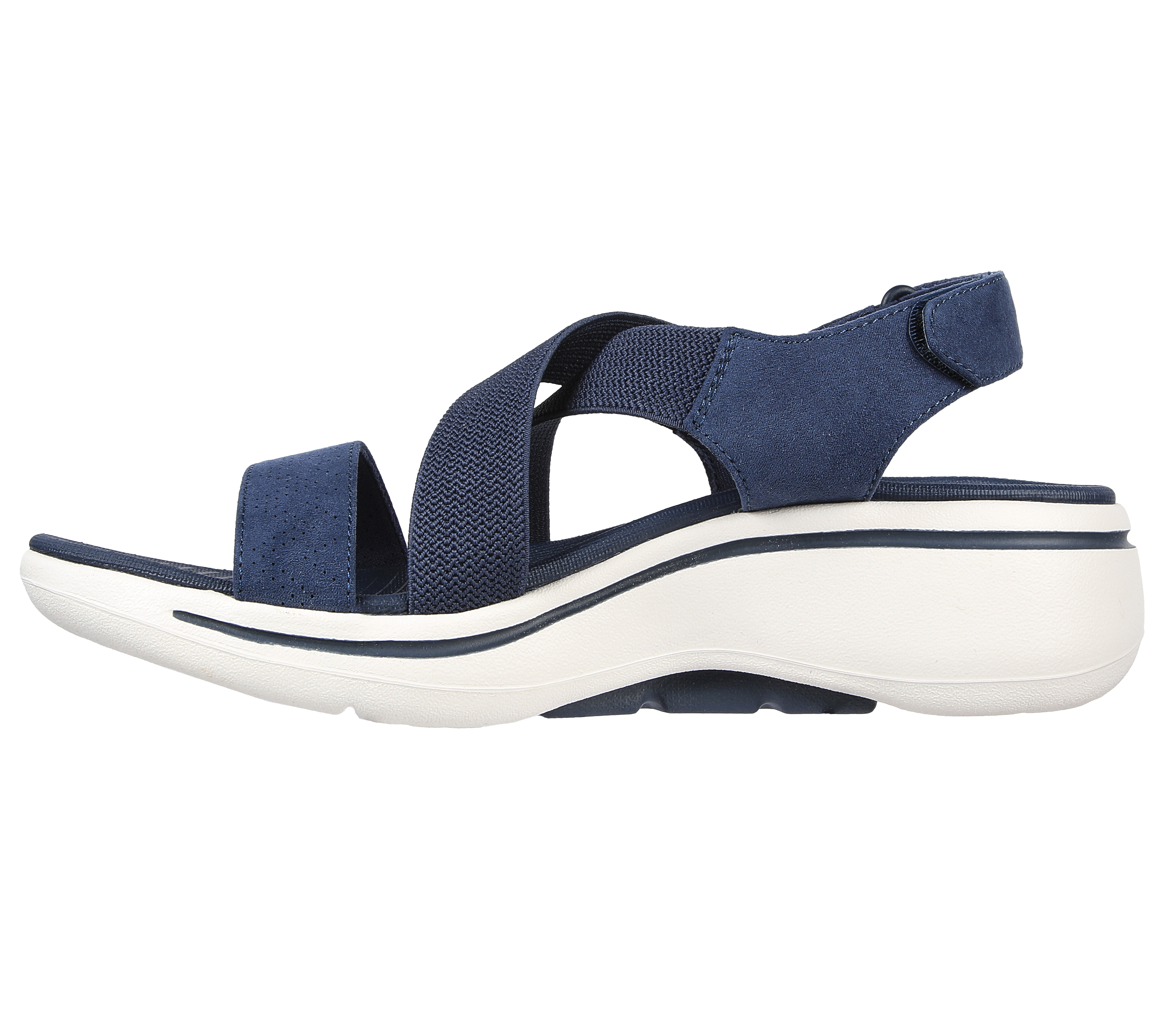 Sandales compensées Skechers bleu navy avec soutien Arch Fit et talon 5 cm. Lavables en machine pour un entretien facile. Commandez en ligne dès maintenant