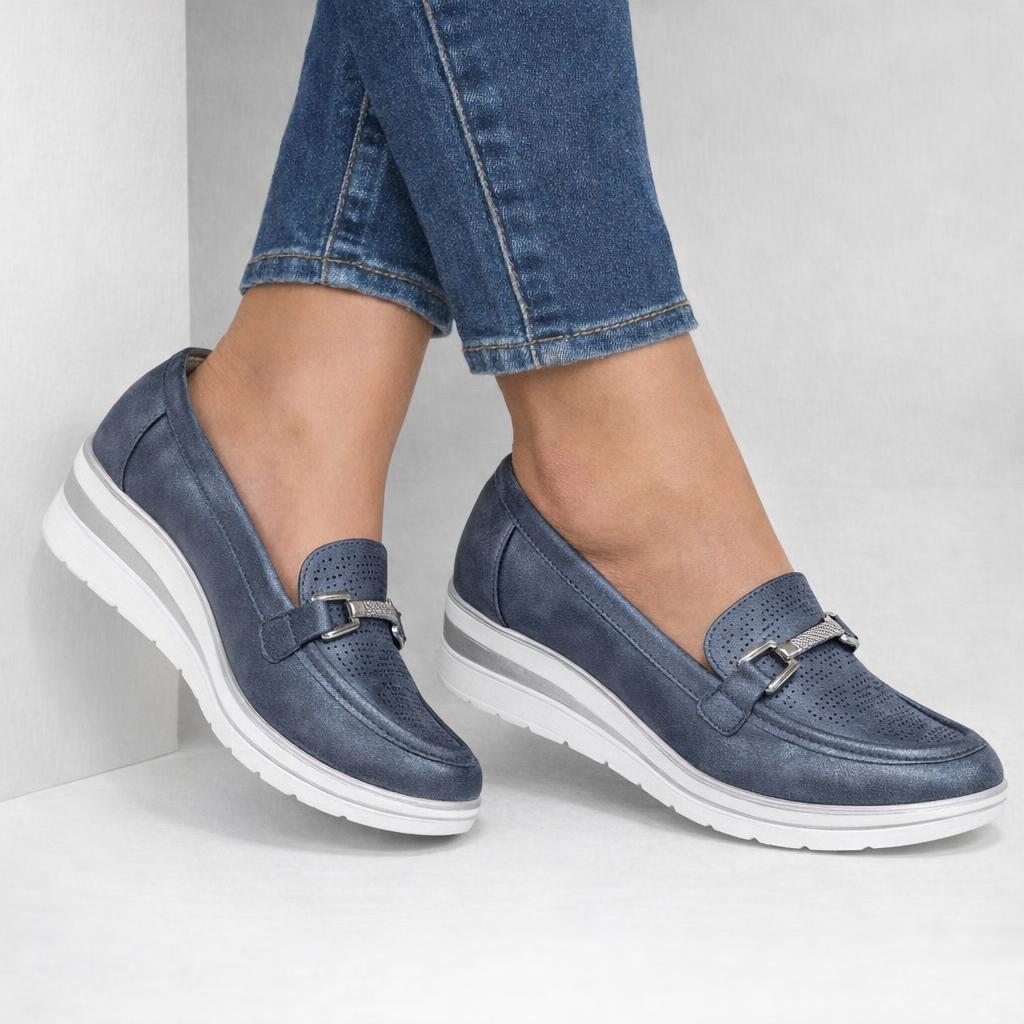 Mocassins compensés Bleu/Jeans au style facile. SoftFoam pour marcher léger au quotidien. Commandez en ligne