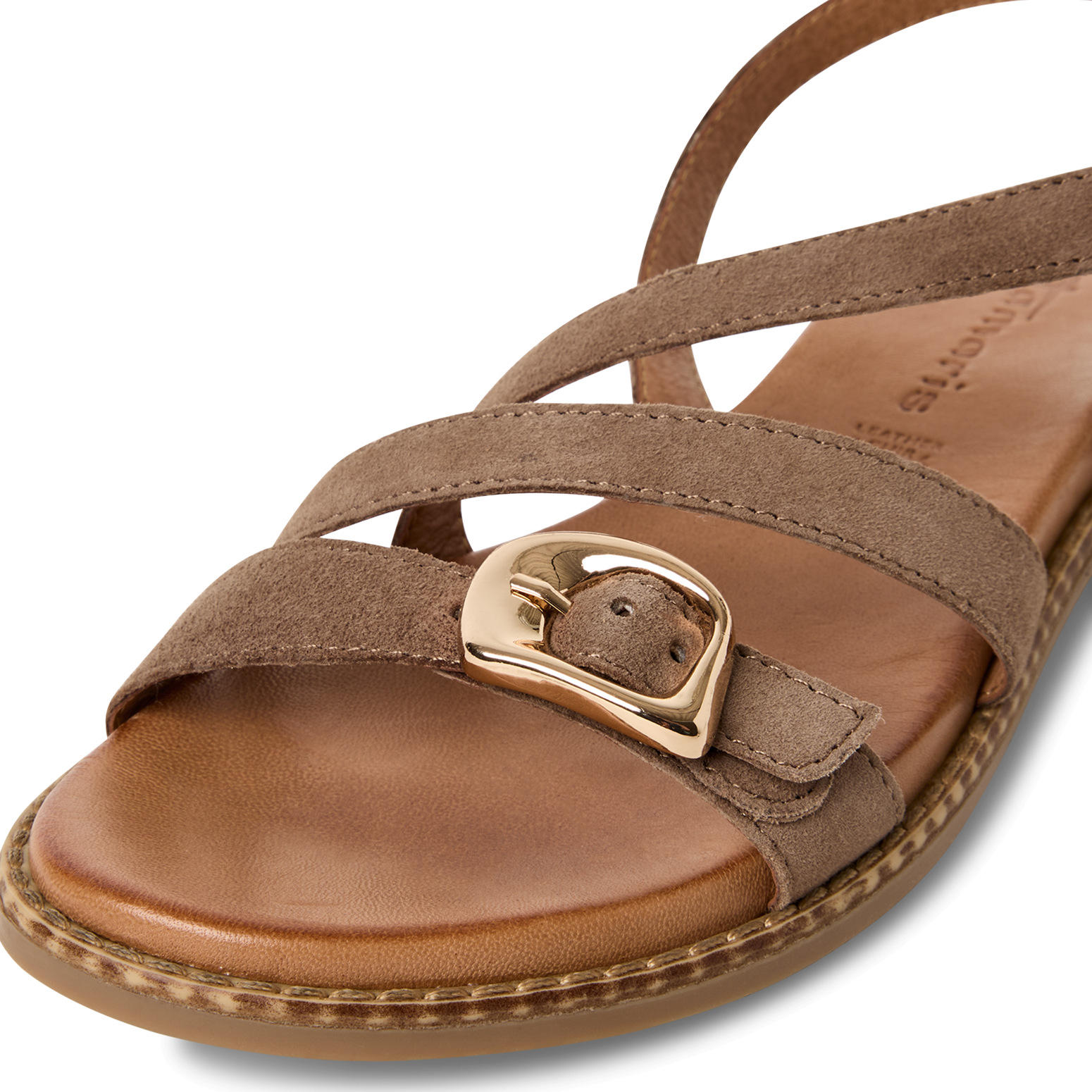 Sandales plates taupe en cuir Tamaris Comfort. Idéales pour marcher toute la journée. Commandez en ligne