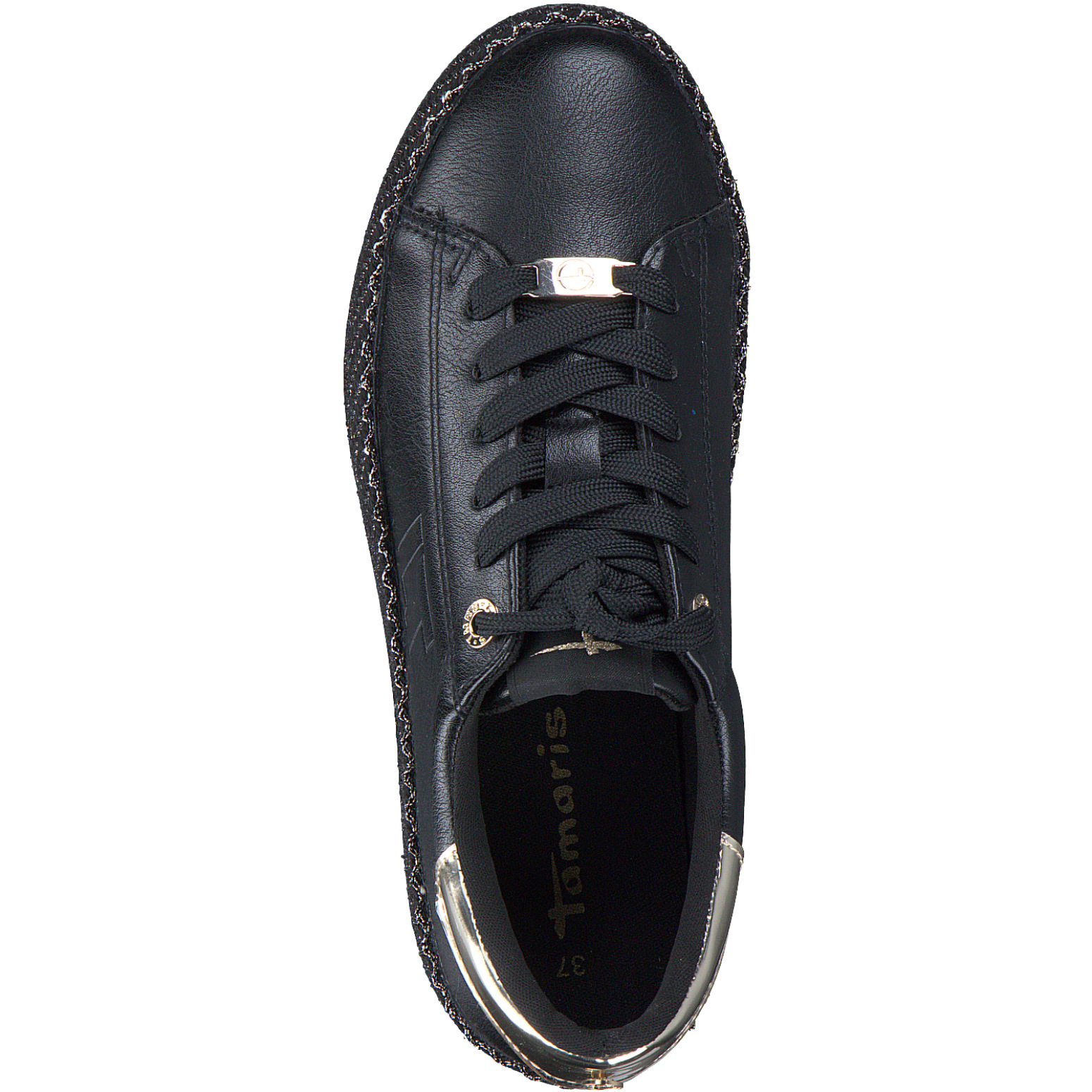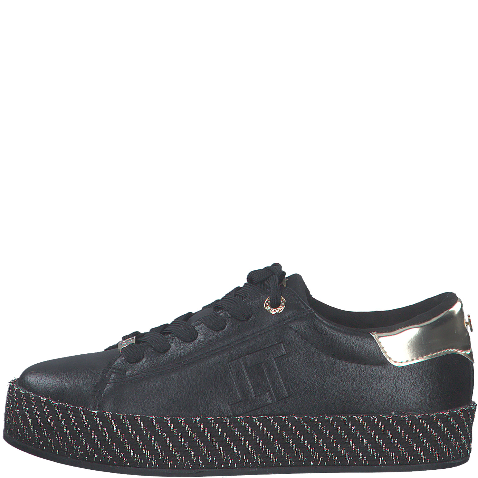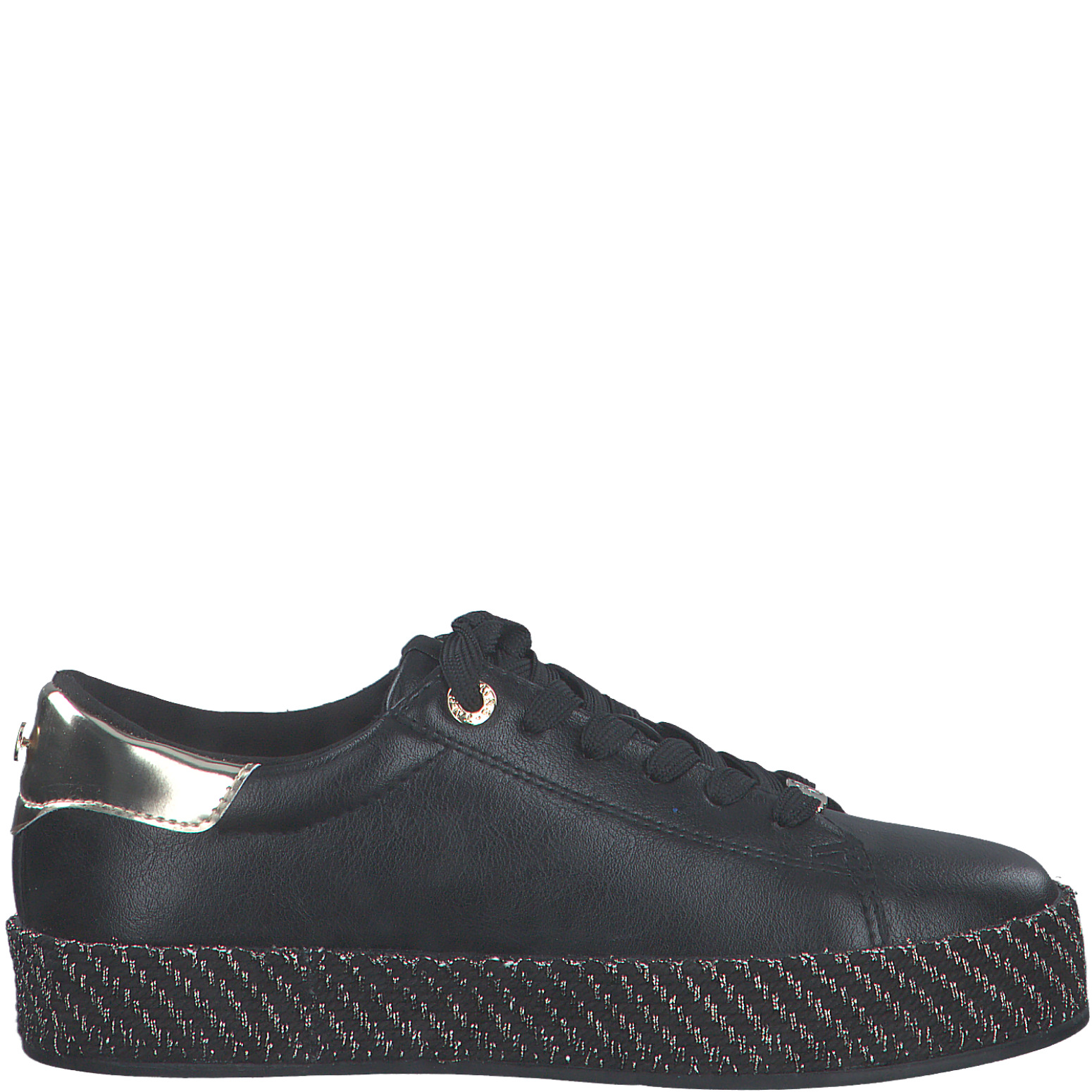 Sneakers Tamaris compensées en cuir synthétique noir et or, alliant style et confort longue durée. Idéales pour un look moderne au quotidien. Commandez-les en ligne dès maintenant